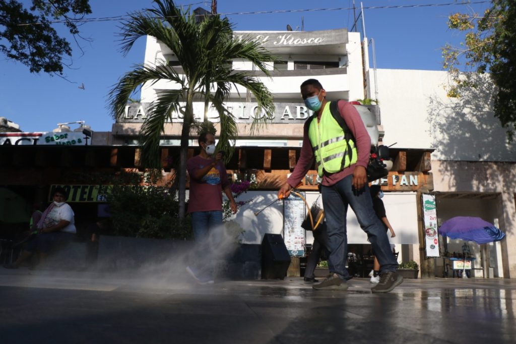 La presidenta municipal Adela Román Ocampo verificó los trabajos de limpieza y desinfección que se realizan en el zócalo de la ciudad, como parte del reforzamiento de los operativos para contener contagios del virus SARS-CoV-2, causante de COVID-19.