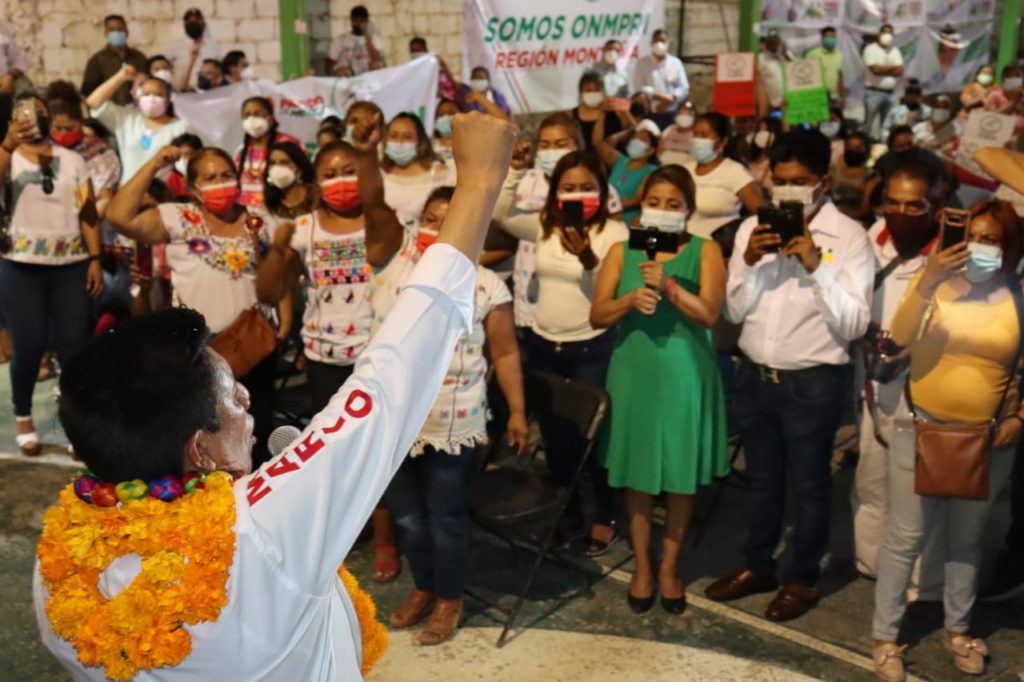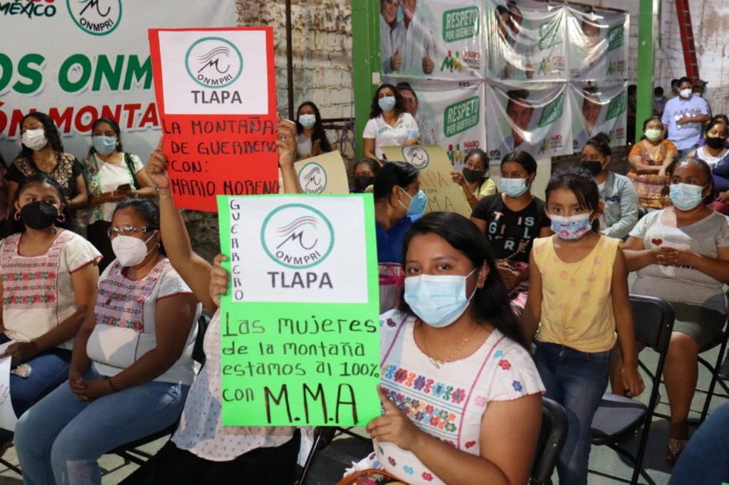 Gregoria Osorio, líder de la ONMPRI en la región, le dijo: “Montaña se escribe con M de Mario Moreno, Las mujeres ya decidimos , con usted nos sentimos seguras, porque Mario Moreno es el gobernador del respeto”, lo que le fue secundado con aplausos.