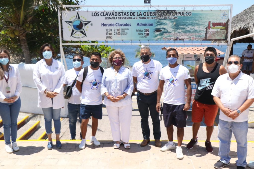 Acompañada del secretario de Turismo, Jose Luis Basilio Talavera y la directora de Salud, Roxana Tapia Carbajal, acudió además al área de clavados de La Quebrada, siendo recibida por el presidente de la Asociación de Clavadistas, Gustavo Gatica, con quien recorrió el acceso principal, verificó la aplicación de gel antibacterial, el control de acceso a la explanada, la toma de temperatura y el pago del servicio.