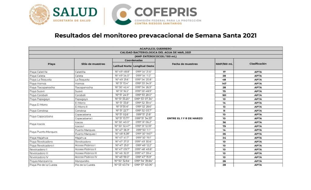 La funcionaria indicó además que como resultado del compromiso de la alcaldesa Román Ocampo por mejorar las condiciones de la infraestructura hidrosanitaria y vigilar que no haya descargas de aguas negras en el puerto, todas las playas de Acapulco son aptas para uso recreativo, lo cual quiere decir que no hay contaminación de la bahía por escurrimientos residuales, según el reporte del monitoreo de enterococos hecho por la Comisión Federal para la Protección contra Riesgos Sanitarios (Cofepris), realizado del 1 al 8 de marzo.