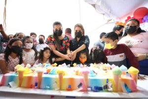 La gobernadora, acompañada por su hijo Mateo y su mamá, María de Jesús Pineda, felicitó a las niñas y niños que se dieron cita acompañados por sus padres a este gran festejo, donde también pudieron disfrutar de antojitos mexicanos, dulces y el tradicional pastel para celebrar el Día de la Niña y el Niño.