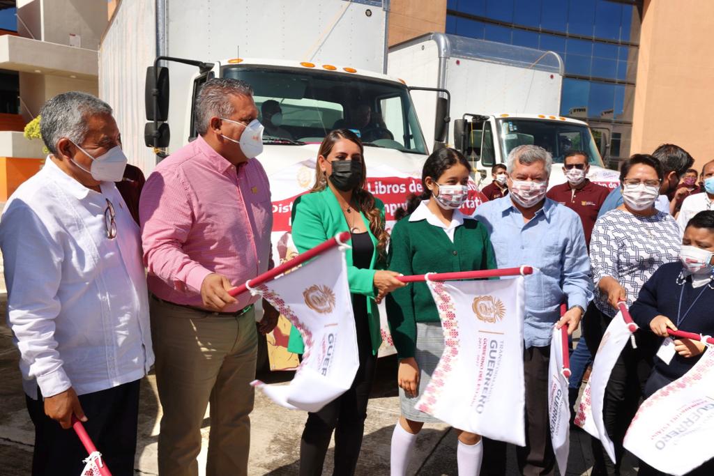 Chilpancingo, Gro., 08 de julio del 2022. – Como parte de la gran Revolución Educativa que se realiza en Guerrero, la gobernadora Evelyn Salgado Pineda, dio el banderazo de salida a la distribución de más de 4 millones 700 mil ejemplares de Libros de Texto Gratuitos a las más de 9 mil escuelas de nivel básico de todo el Estado, para ser entregados, en tiempo y forma, a los 764 mil 441 estudiantes para el inicio del Ciclo Escolar 2022-2023.