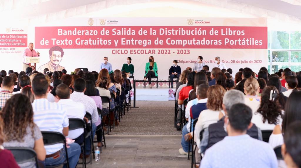 Durante el evento celebrado en la explanada de la Casa del Pueblo en Chilpancingo, la titular del Ejecutivo estatal destacó que en Guerrero se distribuirán 4 millones 774 mil 369 ejemplares de Libros gratuitos, beneficiando a 764 mil 441 alumnos de nivel básico, así como a 39 mil 607 maestras y maestros de 9 mil 95 escuelas a lo largo y ancho del Guerrero.