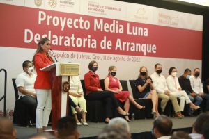 Acapulco, Guerrero., 11 de agosto de 2022.- En Guerrero priorizamos el bienestar, el desarrollo sustentable y la transformación, a través del impulso al trabajo coordinado entre el gobierno, las empresas y el pueblo, señaló la gobernadora Evelyn Salgado Pineda durante la declaratoria de arranque de Proyecto de la empresa minera Media Luna, en donde se anunció una inversión de 848 millones de dólares -es decir, alrededor de 17 mil millones de pesos-, para la continuidad de sus operaciones en la entidad.