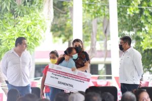 Enseguida la mandataria hizo entrega de semilla mejorada de maíz a 451 beneficiarios; paquetes de feromonas para control del gusano cogollero a 405 productores; fertilizante químico orgánico para maíz a 415 agricultores; 50 desgranadoras de 6.5 caballos de fuerza; 200 aspersoras de 20 litros; 200 rollos de alambre; 25 bestias mulares; 15 lechones; así como 30 sementales bovinos de registro, con un apoyo de 20 mil pesos a cada ganadero.