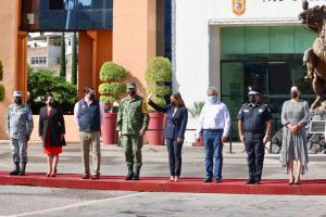 Con los honores correspondientes, Evelyn Salgado, junto con el comandante de la 35 zona Militar, Enrique Martínez López y el secretario de Protección Civil Estatal, Roberto Arroyo Matus, izó la Bandera Monumental a media asta con el toque de silencio por la banda de la guerra de la Secretaría de Seguridad Pública, en memoria de las víctimas por los sismos de 1985 y 2017.