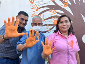 El mural simbólico quedó plasmado en la pared como un árbol de vida con las manos naranjas y frases en conmemoración del Día Internacional para la Eliminación de la Violencia contra las Mujeres y Día de los Derechos Humanos.