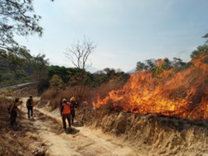 Chilpancingo, Gro., 14 de abril de 2023.- Desde esta tarde, bomberos de la Secretaría de Gestión Integral de Riesgos y Protección Civil, trabajan para controlar y sofocar en su totalidad el incendio forestal que se registra en la zona conocida como “Cerro del Toro”, cerca del poblado del Ocotito, municipio de Chilpancingo.