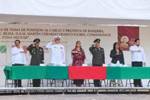 Enseguida el comandante de la Novena Región Militar, Ricardo Flores González tomó la Protesta de Ley así como la Toma de Posesión al Cargo al nuevo encargado de la 27 Zona Militar; enseguida se llevó a cabo la presentación de los mandos ante el comandante Martín Gerardo Franco Flores.