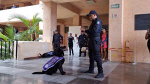 En el exterior de la sala de conferencias de la UAA instalaron módulos de información de las Unidades de Prevención Social del Delito, Tránsito Estatal y la Unidad Policial de Género. Además, la Unidad Canina de la Policía Estatal realizó una exhibición del trabajo de obediencia básica, avanzada y pista de agilidad de los binomios.