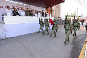 Previo al inicio del desfile cívico – militar, acompañada por titulares de los poderes Judicial y Legislativo, mandos navales y militares, la gobernadora Evelyn Salgado montó una guardia de honor al pie del monumento a Vicente Guerrero en el zócalo de la ciudad.