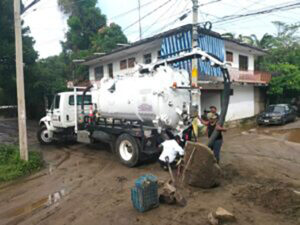 Así también, agregó que se está prestando apoyo emergente con el equipo hidrováctor de este Organismo estatal, que se encuentra trabajando en la cabecera municipal de Tecpan, donde han estado realizando labores de desazolve urgente del sistema de alcantarillado y drenaje, retirando taponamientos que se formaron por el arrastre de tierra, piedras y residuos sólidos.