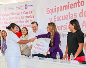 Acompañada por el rector de la Universidad Autónoma de Guerrero, Javier Saldaña Almazán, la gobernadora entregó de manera simbólica a casas de estudiantes 100 laptops, 230 colchones, 50 refrigeradores, 100 estufas y 300 lockers y a las escuelas de nivel superior pintarrones, proyectores, impresoras, ventiladores, butacas y sillas, que permitirán a las y los jóvenes que habitan en casas de estudiantes tengan mejores condiciones para su desempeño académico.