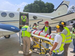 Chilpancingo, Gro., 25 de abril de 2024.- La Secretaría de Salud Guerrero (SSG) a través del Centro Regulador de Urgencias Médicas (CRUM) realizó el traslado aéreo de paciente para atención médica especializada en quemados desde el Hospital General Raymundo Abarca Alarcón al Centro Nacional de Investigación y Atención al Paciente Quemado (CENIAQ) en Ciudad de México.