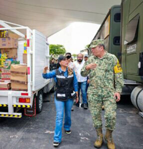 Junto al comandante de la Novena Región Militar, Enrique Martínez López, la mandataria estatal explicó que de manera coordinada con la Secretaría de la Defensa Nacional (Sedena), diariamente se dota de más de 2 mil 500 raciones de comida caliente, lo que permite ofrecer alimento por la mañana, tarde y noche a la población damnificada.
