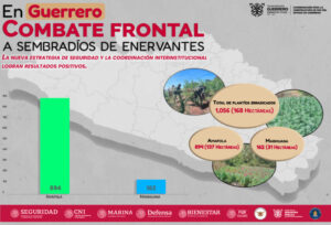 De igual forma, indicó que este logro representa un avance significativo en la erradicación de enervantes en las ocho regiones del estado, dentro de la estrategia de seguridad implementada, como parte de las acciones de los integrantes de la Mesa de Coordinación para la Construcción de la Paz en Guerrero, en la ruta de la pacificación.