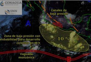 Informó, además, que se mantiene en vigilancia a una zona de baja presión, la cual presenta 10 por ciento de probabilidad para desarrollo ciclónico en 48 horas y 70 por ciento de probabilidad para desarrollo ciclónico en siete días, ubicada al sur de las costas de Chiapas, aproximadamente a mil 200 kilómetros al sureste de Punta Maldonado Guerrero, se desplaza al oeste noroeste.
