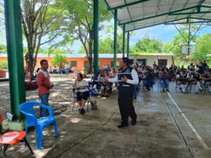 Quechultenango, Gro; 2 de julio de 2025.- La Secretaría de Seguridad Pública del Estado de Guerrero, a través de la Dirección General de Prevención Social del Delito, llevó a cabo una jornada preventiva en la Escuela Secundaria Aarón M. Flores, ubicada en la localidad de Colotlipa, municipio de Quechultenango, enfocada en la prevención del consumo de drogas y la promoción de entornos escolares seguros.