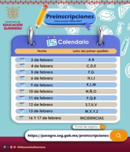 Chilpancingo, Gro., 26 de enero de 2026. La Secretaría de Educación Guerrero (SEG) emitió la circular para el proceso de preinscripciones para educación básica, que se llevará a cabo del 3 al 13 de febrero.