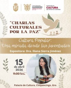 Chilpancingo, Gro., 10 de abril de 2026— El gobierno de Guerrero, a través de la Secretaría de Cultura, invita al público en general a una nueva sesión del programa “Charlas Culturales por La Paz”, iniciativa que busca fortalecer el diálogo y la reflexión en torno a las expresiones artísticas y sociales del estado.